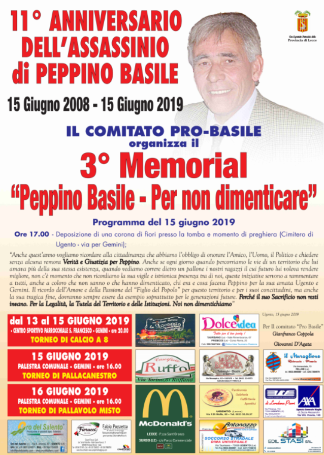 Anche quest’anno ed in occasione della ricorrenza dall’undicesimo anno dall’assassinio, gli amici del Comitato “Pro Basile” hanno deciso di ricordare Peppino Basile, consigliere provinciale e comunale di Ugento barbaramente trucidato la notte del 15 giugno 2008 e la cui tragica fine è rimasta uno dei casi irrisolti degli ultimi anni perché rimasto senza alcun colpevole. Come ogni anno i suoi amici e i cittadini che hanno aderito al comitato hanno deciso di organizzare una serie di iniziative a partire dallo scorso 13 e sino al 16 del mese, per ricordare l’Amico, l’Uomo ed il Politico che coinvolgeranno soprattutto i giovani, che nella vita di Peppino Basile hanno rappresentato uno dei più grandi interessi della sua attività di combattivo e passionario rappresentante delle istituzioni.