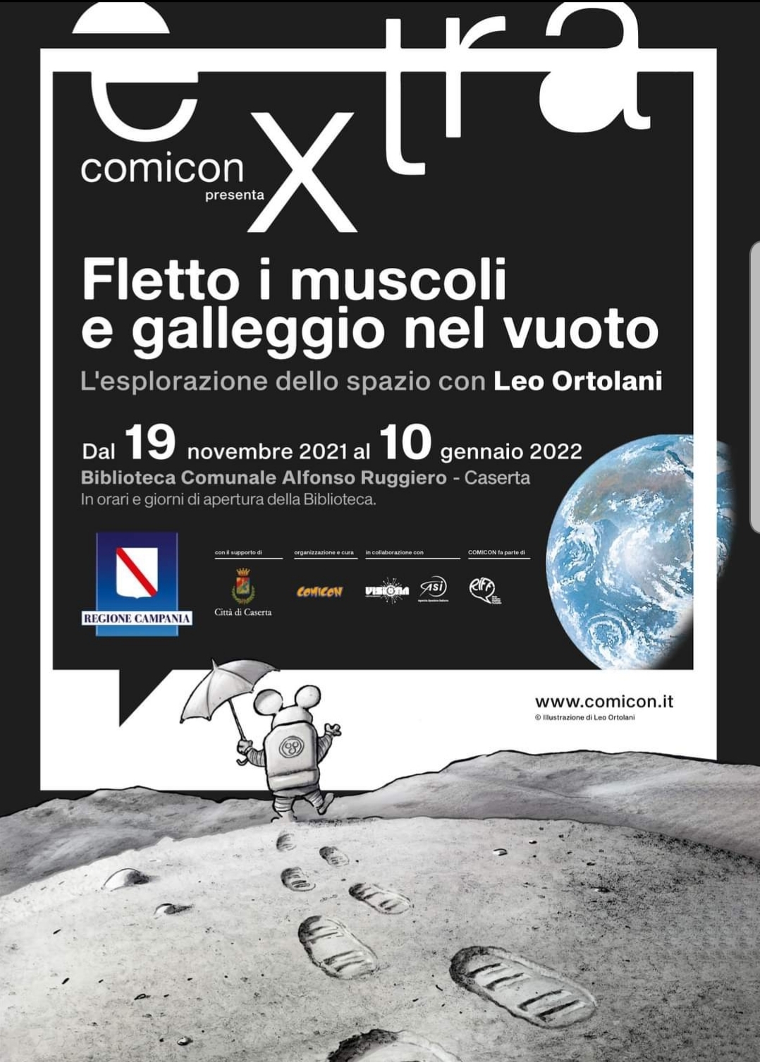 COMICON Extra sbarca a Caserta con la mostra Leo Ortolani. Fletto i muscoli e galleggio nel vuoto, a partire da venerdì 19 novembre presso la Biblioteca Comunale Alfonso Ruggiero fino al 10 gennaio 2022.