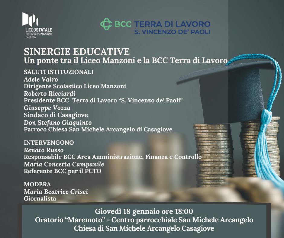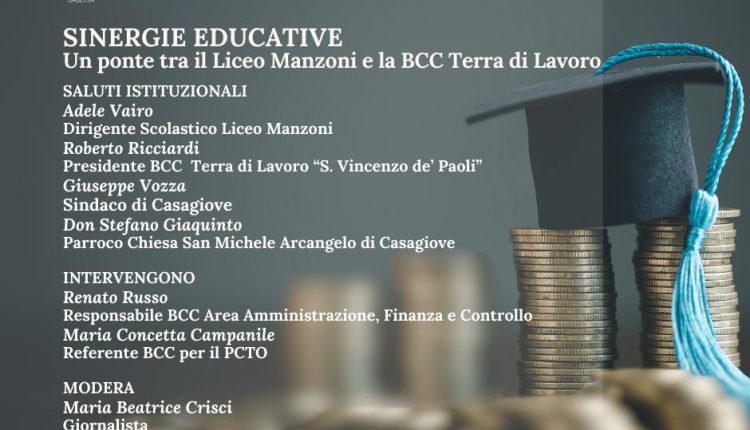 L’evento, dal titolo eloquente “Sinergie Educative: un ponte tra il Liceo Manzoni e la BCC-Terra di Lavoro”, si terrà giovedì alle ore 18.00 presso la Sala Conferenze dell’oratorio “Maremoto” della Chiesa di San Michele Arcangelo di Casagiove. Moderato dalla giornalista Maria Beatrice Crisci, l’incontro vedrà i saluti istituzionali di Don Stefano Giaquinto e del Sindaco di Casagiove Giuseppe Vozza, gli interventi del Presidente della BCC, Roberto Ricciardi, e del Dirigente Scolastico, Adele Vairo. Tra i relatori, Renato Russo – Responsabile  BCC Area Amministrazione, Finanza e controllo e Maria Concetta Campanile, referente Bcc per il Pcto.