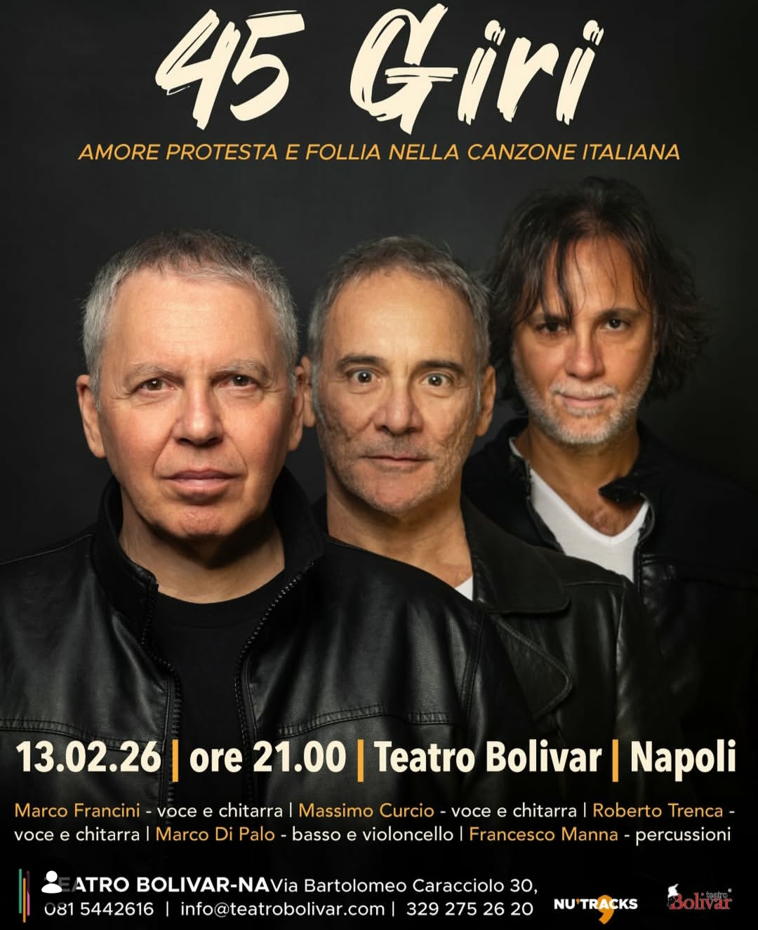 Venerdì 13 febbraio, alle ore 21.00, al Teatro Bolivar di Napoli (Via Bartolomeo Caracciolo, 30), diretto da Nu’Tracks, arriva “45 Giri”, uno spettacolo di Marco Francini che, con la sua band, racconta e concentra i temi e i brani che hanno fatto grande la canzone italiana: amore, protesta e follia. La Canzone Italiana dagli anni ’50 ad oggi rappresenta uno straordinario patrimonio di musica e poesia. Autori, interpreti e cantautori sono stati i protagonisti di intere generazioni e hanno scandito il tempo con le emozioni e con l’intensità della melodia e del canto.