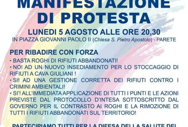 La manifestazione si terrà il giorno 5 agosto 2019 a partire dalle ore 20,30 sul Sacrato della Parrocchia S. Pietro Apostolo di Parete in Piazza Giovanni Paolo II. Il tema della protesta e degli interventi dei vari rappresentanti delle Associazioni, Movimenti, Comitati e cittadini, riguarderà i continui roghi di rifiuti che si perpetuano da anni in questa zona, tra Parete, Giugliano, Trentola Ducenta e Lusciano, nonché nel vasto territorio della cosiddetta “Terra dei Fuochi”. Fenomeno che, in questi ultimi tempi, ha visto un vertiginoso aumento con innalzamento del livello di pericolo per la salute dei cittadini e di escalation criminale, dal momento che si sono verificati anche incendi dolosi di impianti e discariche da anni abbandonate con la combustione di sostanze estremamente pericolose e il tentativo fallito, di pochi giorni fa, di appiccare il fuoco alle sei milioni di tonnellate di balle di rifiuti di Taverna del Re.