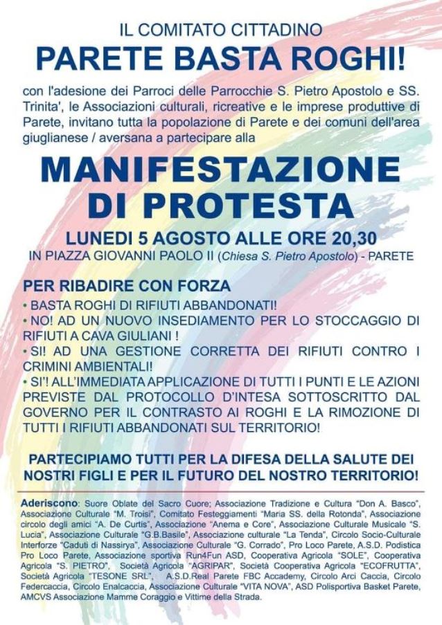 PARETE – 5 agosto 2019, Manifestazione di Protesta del Comitato Cittadino “Parete Basta Roghi!”. Anche la Caritas, le Parrocchie cittadine e la società civile aderiscono alla manifestazione che si terrà a partire dalle ore 20,30 sul Sacrato della Parrocchia S. Pietro Apostolo di Parete.