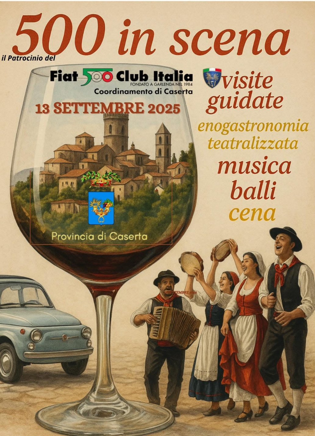 A partire dalle ore 18, le strade del borgo si riempiranno di colori e atmosfere uniche: il fascino delle Fiat 500 d’epoca incontrerà musica dal vivo, canti e danze popolari, trasformando Casertavecchia in un palcoscenico a cielo aperto.Non sarà solo uno spettacolo, ma un’esperienza completa: visite guidate, percorsi di enogastronomia teatralizzata, momenti di convivialità con balli e una cena comunitaria pensata per esaltare il gusto autentico del nostro territorio. Ma la vera forza di “500 in scena” non è solo nel programma, ma nel clima che lo accompagna: l’entusiasmo delle persone, la voglia di condividere, il piacere di sentirsi parte di una comunità.