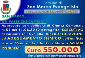 Individuazione interventi nell’ambito della progettazione triennale 2015-2017 di cui al fondo art.1, comma 140, legge 11/12/2016 n.232”. All’amministrazione comunale di San Marco Evangelista, guidata dal Sindaco Gabriele CICALA, sono andati stati assegnati fondi per la somma complessiva pari a 55.000 ero, di cui 395.000,00 euro per lavori e 155.000,00euro per somme a disposizione dell’amministrazione. In pratica serviranno invece 550mila euro al Comune di San Marco Evangelista per la ristrutturazione, l’adeguamento sismico e l’efficientamento energetico dell’edificio di viale della Libertà adibito a scuola primaria.