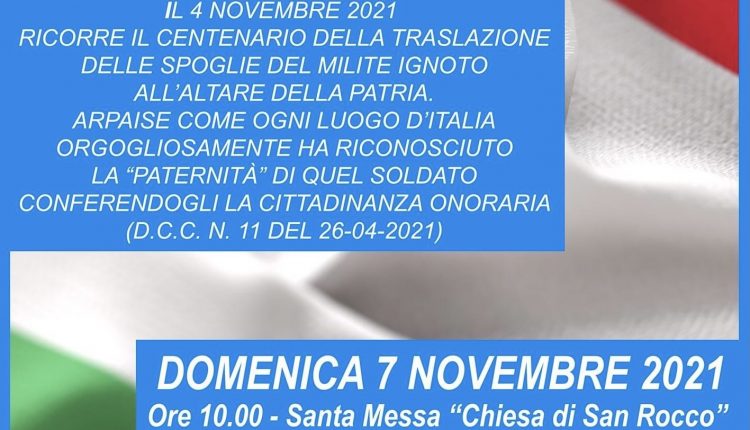 Domenica 7 novembre in località’ Arpaise alle ore ore 10.00 , presso la Chiesa di San Rocco, sarà’ celebrata una Santa Messa in onore dei caduti in tutte le guerre. successivamente sarà deposta una corona al Monumento ai Caduti . Condividi FacebookTwitterWhatsAppTelegramE-mailStampa