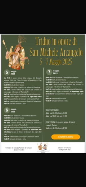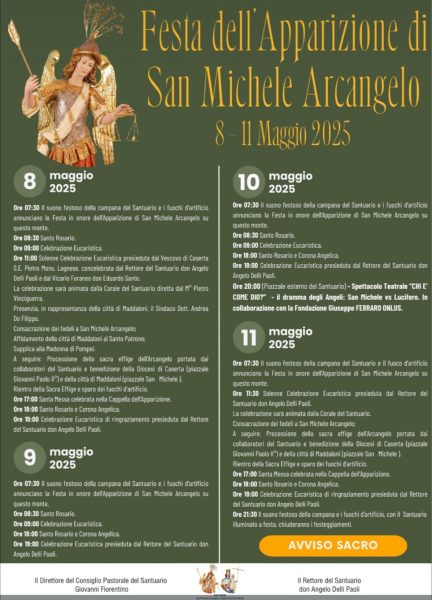 Quest’anno, da domani, giovedì 8 maggio, fino a domenica, come comunicato dal rettore del santuario don Angelo Delli Paoli, la sveglia dei maddalonesi sarà data dal suono festoso delle campane per festeggiare san Michele. Seguiranno 4 giorni di celebrazioni religiose.