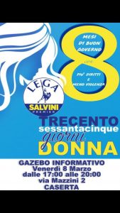 La Lega della città di Caserta, in occasione del giorno della festa della donna, ha organizzato un gazebo informativo nella centralissima via Mazzini a sostegno delle ragioni degli obiettivi conseguiti dal partito negli otto mesi di governo dell’Italia.