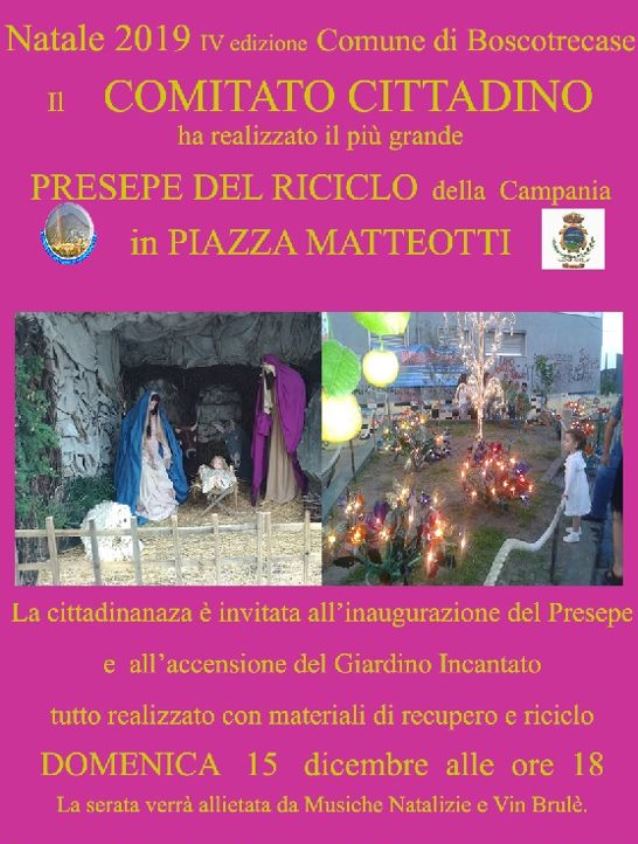 BOSCOTRECASE – Anche quest’anno il Comitato Cittadino di Boscotrecase ha voluto regalare alla collettività il Presepe costruito tutto con materiali di scarto riciclato e trasformato in opere d’arte. Domenica, 15 dicembre 2019, con inizio alle ore 18:00, in Piazza Matteotti in Boscotrecase, sarà inaugurato l’inaugurazione dell’artistico Presepe del Riciclo più grande della Campania e del Giardino incantato.