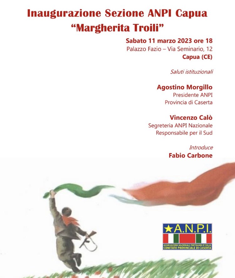 Capua-Sabato 11 marzo alle ore 18.00, nella splendida cornice di Palazzo Fazio in via Seminario 12, sarà presentata la sezione di Capua dell’Associazione Nazionale Partigiani d’Italia. La sezione porterà il nome, nel centodecimo anniversario della sua nascita, della concittadina Margherita Troili, partigiana, antifascista e femminista. All’inaugurazione saranno presenti il Presidente provinciale Anpi Caserta Agostino Morgillo, il Responsabile Anpi nazionale per il Sud Vincenzo Calò, la famiglia di Margherita Troili e tutte le associazioni che operano sul territorio di Capua e si riconoscono nei valori costitutivi dell’Anpi.