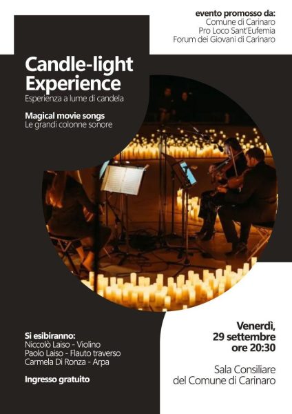 Carinaro, Venerdì 29 settembre, ore 20:30, la Sala consiliare del comune di Carinaro ospiterà un evento speciale voluto dalla pro-loco Sant’Eufemia, dal Forum giovani e dall’amministrazione comunale. Si tratta del candle-light experienced magical movie songs, un viaggio musicale, a lume di candela, tra le migliori colonne sonore cinematografiche rimaste nel cuore di molti. L’ingresso è libero.