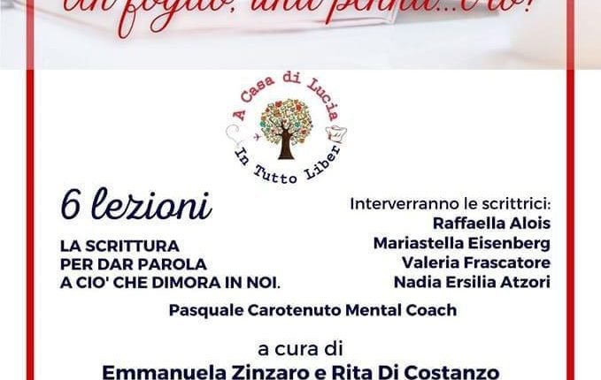 L’associazione “A casa di Lucia”, dall’8 Maggio al 16 Giugno terrà delle lezioni di Scrittura Emotiva a cura di Emanuela Zinzaro e Rita Di Costanzo, durante le quali interverranno anche le scrittrici Raffaella Alois, Mariastella Eisenberg, Valeria Frascatore e Nadia Ersilia Atzori.
