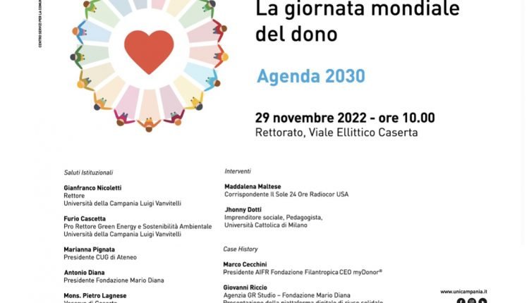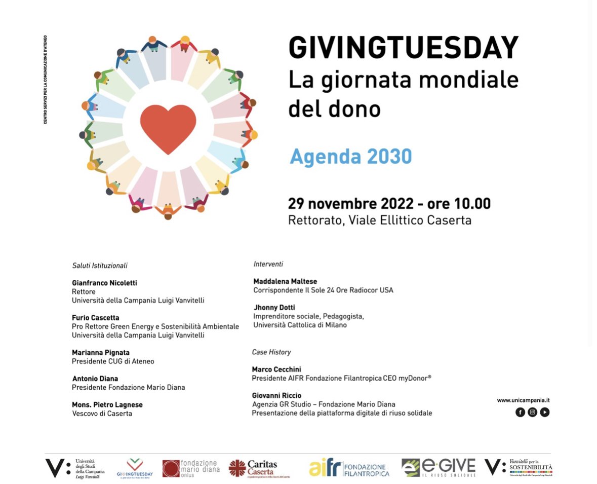 GIVINGTUESDAY – Giornata mondiale del dono – che si svolgerà martedì 29 novembre dalle ore 10.00 presso l’aula magna del Rettorato dell’Università degli studi della Campania “Luigi Vanvitelli di Caserta”, sito in Viale Ellittico.