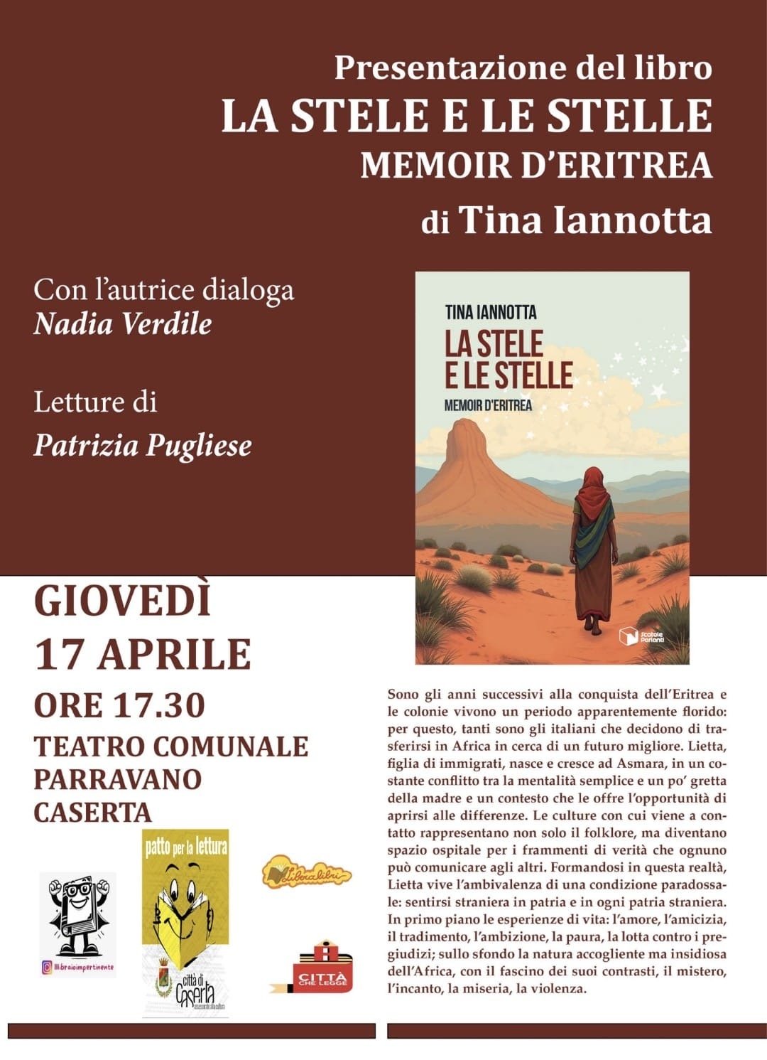 Un viaggio letterario tra le memorie dell’Africa e l’identità in bilico di una giovane donna: giovedì 17 aprile alle ore 17.30, presso il Foyer superiore del Teatro Comunale “Costantino Parravano” di Caserta, in via Mazzini 71, sarà protagonista l’opera “Le stele e le stelle” di Tina Iannotta, edita da Scatole Parlanti.