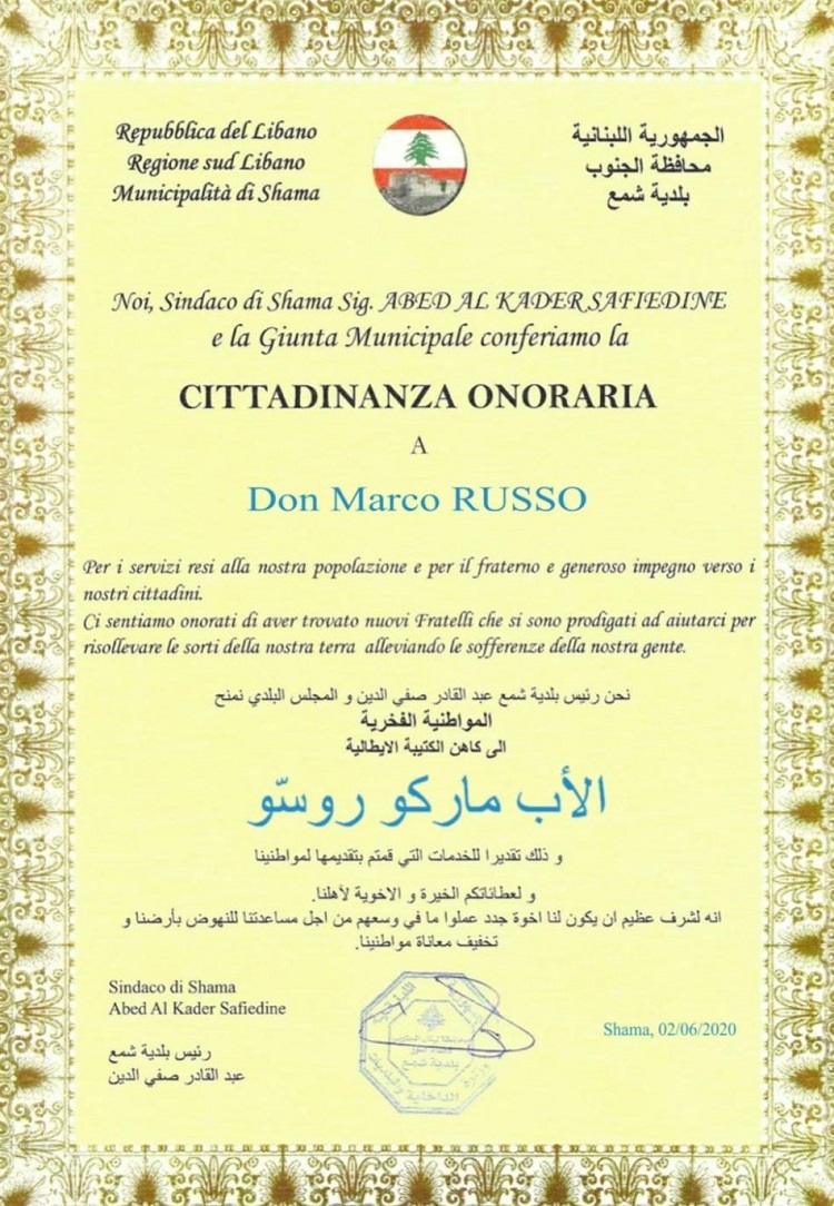 SALERNO – E’ giunta oggi a Don Marco Russo, Direttore della Caritas della Diocesi di Salerno, la Cittadinanza Onoraria della Municipalità di Shama(Libano del Sud), per il lungo ed operoso supporto prestato a titolo personale e nella veste di Direttore della Caritas Salernitana alla popolazione libanese.