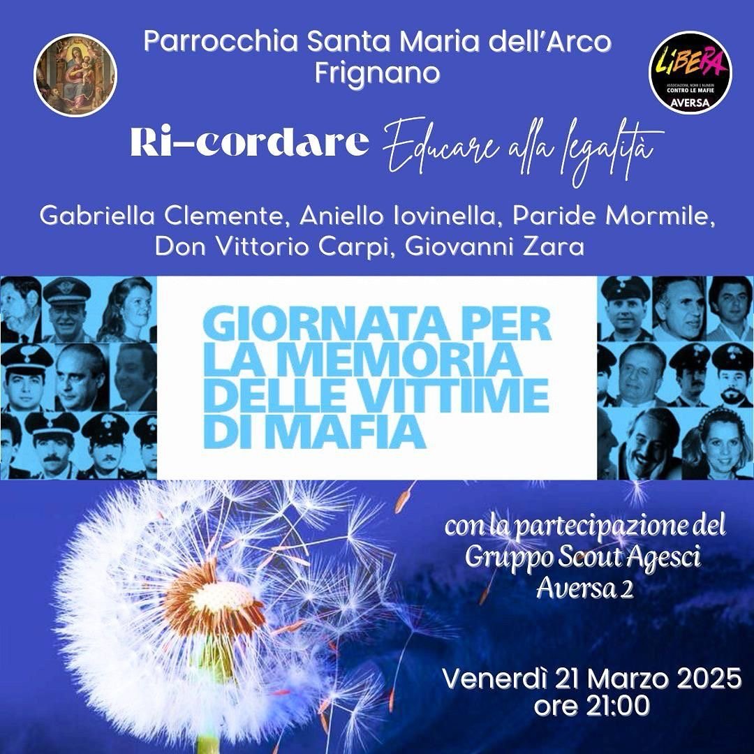 Oggi, venerdì 21 marzo, la Parrocchia Santa Maria dell’Arco di Frignano apre le sue porte a un momento di riflessione profonda e condivisa, in occasione della “Giornata della Memoria e dell’Impegno in ricordo delle vittime innocenti delle mafie”. Alle ore 21:00, l’incontro “Ri-cordare. Educare alla legalità” vedrà la partecipazione di voci autorevoli del territorio, impegnate nel promuovere giustizia, consapevolezza e responsabilità civile.