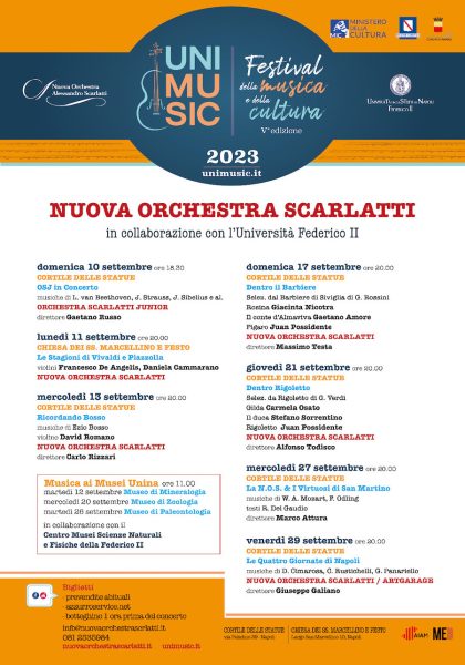 La Nuova Orchestra Scarlatti, che a marzo 2023 ha compiuto 30 anni, torna ad animare il Cortile delle Statue, la Chiesa di San Marcellino e Festo, i Musei scientifici della Federico II con un mix di grande musica, talenti emergenti ed eccellenze campane: partenza domenica 10 settembre nel Cortile delle Statue della Federico II (Via Paladino 39, ore 18.30), con il “Concerto sinfonico dell’Orchestra Scarlatti Junior”; musiche di Mozart, Beethoven, Sibelius e altro ancora; direttore Gaetano Russo.
