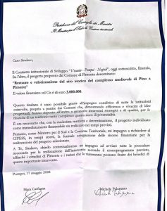 Il Comune di Pimonte ha ottenuto un finanziamento da 3 milioni di euro grazie alla sottoscrizione del Contratto Istituzionale di Sviluppo “Vesuvio – Pompei – Napoli”, destinato al progetto di “Restauro e valorizzazione del sito storico del complesso medioevale di Pino”.