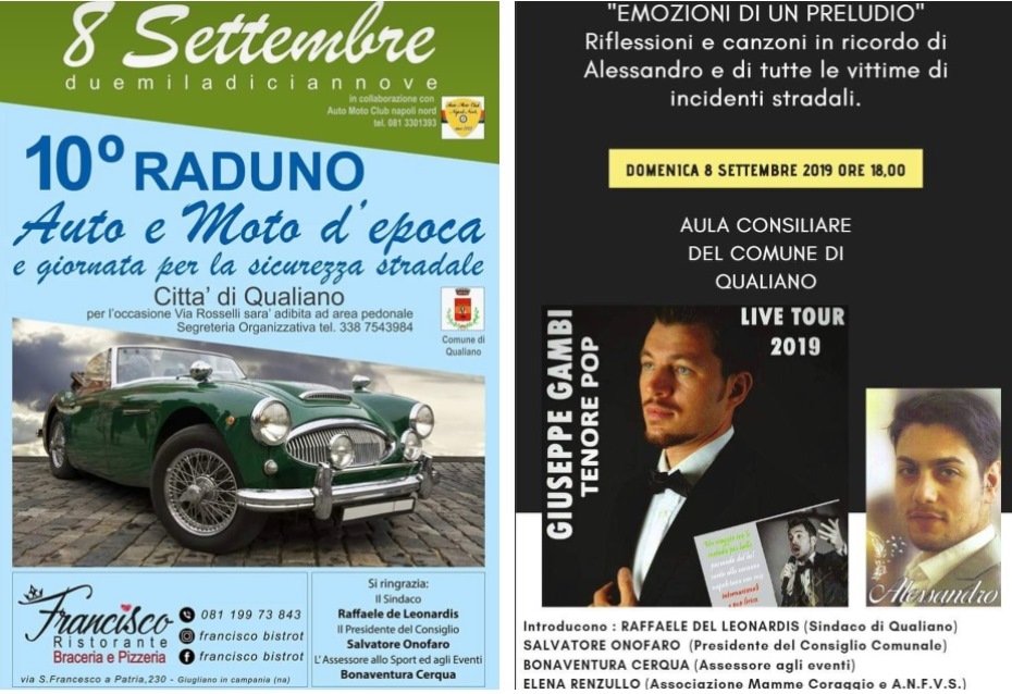 Appassionati e non provenienti da tutta Italia, potranno godersi alcune delle vetture che hanno contraddistinto l’evoluzione del mondo delle quattro ruote, compresi modelli rari risalenti agli anni ’30 e ’40. Nel pomeriggio, a partire dalle 18:00, presso l’aula consiliare del comune di Qualiano, il tenore Pop Giuseppe Gambi dedicherà un mini concerto, intitolato “Emozioni di un preludio”, alle vittime della strada e, in particolare, ad Alessandro Selvaggio, scomparso a 20 anni a seguito di un incidente consumatosi in via Corigliano, nei pressi del “Ponte di Surriento”. Sarà occasione di riflettere sul dramma che vivono le famiglie delle vittime della strada, spesso lasciate sole dalle istituzioni e condannate all’ergastolo del dolore.