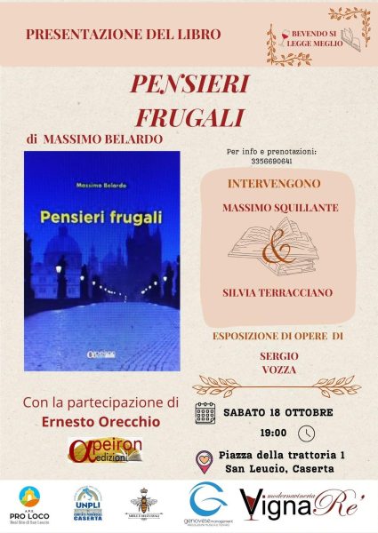 Sabato 18 ottobre alle ore 19:00, in Piazza della Trattoria 1 a San Leucio (Caserta), si terrà la presentazione del libro Pensieri frugali di Massimo Belardo, edito da Apeiron Edizioni, nell’ambito della rassegna “Bevendo si legge meglio”, promossa dalla Pro Loco Real Sito di San Leucio.