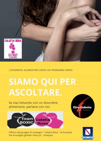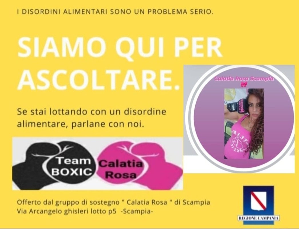 Napoli – Il supporto di Calatia Rosa cresce ed ascolta le esigenze della realtà in cui opera. nasce “Siamo qui per ascoltare” il nuovo sportello dell’associazione casertana nel cuore di Scampia. Lo sportello, che ha sede nella palestra ASD “Le ali di Scampia”, dedicata alla giovane Gelsomina, vittima di camorra, in collaborazione con la Regione Campania, è un punto di ascolto per le ragazze che soffrono del male oscuro dell’anoressia. “Ancora una volta lo sport e il sociale insieme per le donne e per i giovani, per aiutarli ad uscire da uno dei tanti tunnel che affliggono la nostra società” – ha dichiarato con orgoglio il fondatore di Calatia Rosa Clemente Di Crescenzo,che condividerà questa nuova avventura con la referente di Calatia Rosa su Scampia Cira Celotto.