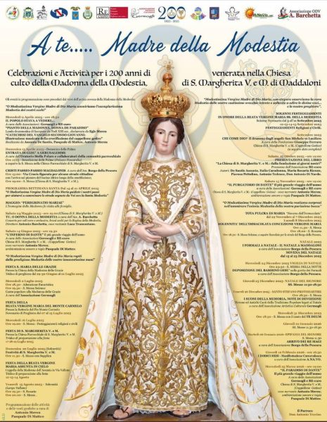 L’intero quartiere e tutta la comunità parrocchiale, sulla spinta del giovane parroco don Antonio Traviso, si è impegnata con passione, per approntare un fitto calendario di iniziative religiose e culturali che prenderanno il via mercoledì 9 aprile e si concluderanno il 25 marzo 2026. Tra tutti coloro che hanno contribuito alla realizzazione di queste iniziative, è doveroso menzionare Filomena Pizzuti, una giovane che ha creato il logo dei 200 anni della Madonna della Modestia.
