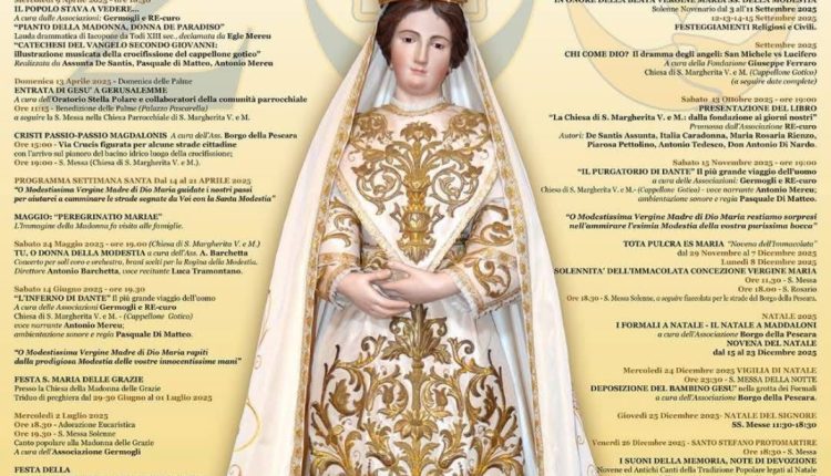 Seguiranno nel mese di aprile una serie di iniziative riguardanti le celebrazioni pasquali. Il mese di maggio sarà dedicato a Maria, mentre a giugno ci sarà la prima delle tre cantiche della Divina Commedia di Dante, l’Inferno. Il programma continua con le celebrazioni dedicate alle Madonne delle Grazie, del Carmelo di santa Margherita e dell’Assunta, per arrivare a settembre proprio con i festeggiamenti per la Madonna della Modestia. A fine settembre è previsto un evento in onore del santo Patrono della città, san Michele. Ad ottobre l’evento clou con la presentazione del libro “La chiesa di santa Margherita V. e M. dalla fondazione ai giorni nostri”.