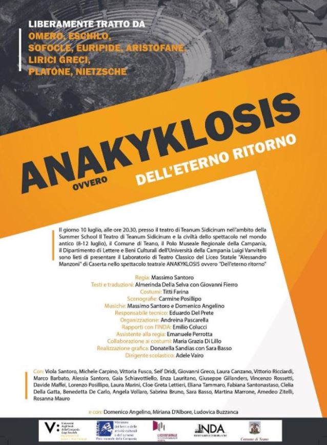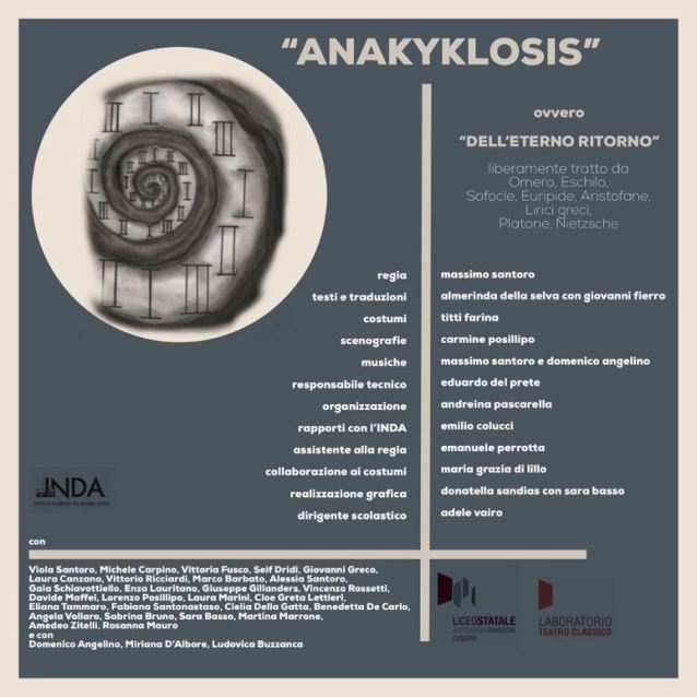 Così, infatti, recita una delle battute di “ANAKYKLOSIS , ovvero dell’Eterno Ritorno”, l’opera in cui i giovanissimi interpreti, studenti dal primo al quinto anno liceale, si cimenteranno con codici espressivi diversi: dall’epico al tragico, dal comico al lirico. Una grande contaminazione che investe lo spettatore attraverso lingue, costumi, suoni e stranianti associazioni temporali: tutto volto a dimostrare l’attualità di un messaggio e di una Parola, quella dei Greci, che di “antico” ha solo la convenzione linguistica appartenente al significante, mentre si staglia ancora di più in una semantica poderosa ed inequivocabilmente fuori dal tempo per diventare un consiglio dettato al cuore di chi lo com-prende.