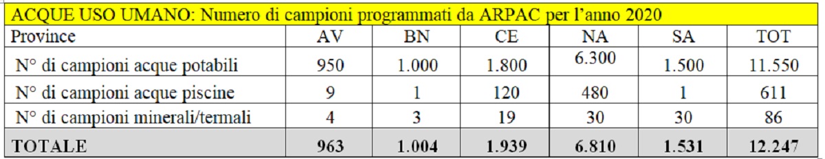 Ricordiamo che i controlli effettuati da Arpa Campania e Asl si sommano a quelli realizzati dai gestori idrici e interessano i punti in cui le acque sono disponibili per il consumo, e inoltre gli impianti di adduzione, di accumulo e di potabilizzazione, le reti di distribuzione, gli impianti di confezionamento in bottiglia o in contenitori, eccetera.
