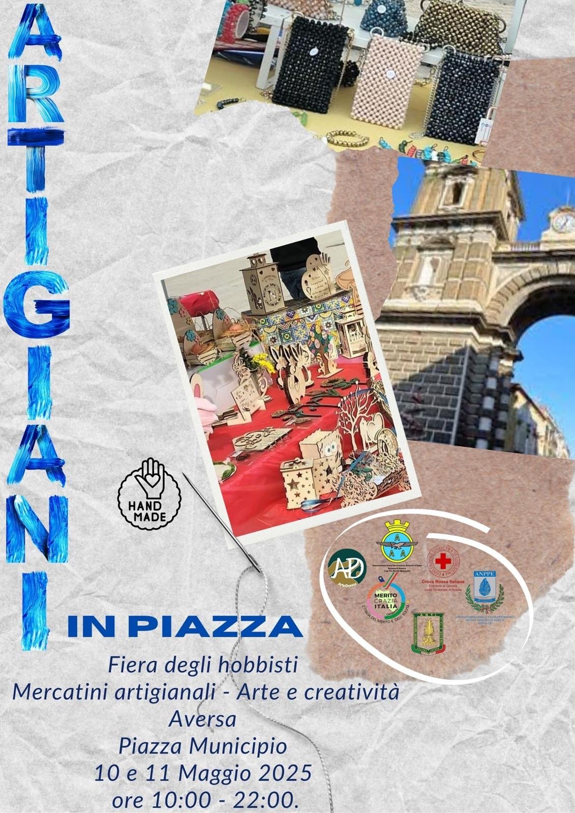 Si terrà ad Aversa oggi e domani in piazza Municipio, dalle ore 10:00 alle 22:00 l’iniziativa ARTIGIANI IN PIAZZA. Fiera degli hobbisti – Mercatini artigianali – Arte e creatività.