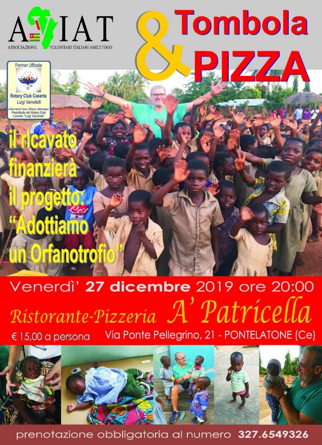 PONTELATONE – Tombolata di Natale a scopo benefico si terrà venerdì, 27 dicembre 2019, a Pontelatone dove da tempo è attiva una sezione di Aviat capitanata a livello provinciale dal medico e già sindaco Antonio Carusone. A partire dalle ore 20:00, presso il Ristorante Pizzeria ‘A Patricella, andrà in scena l’evento di beneficienza promosso dall’Associazione Volontari Italiani Amici del Togo (AVIAT).