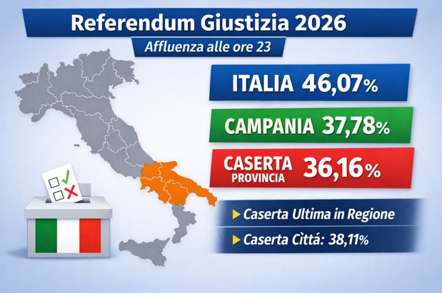 Seggi aperti fino alle 15:00 di oggi, lunedì 23 marzo. I dati dell’affluenza registrati nella giornata di domenica delineano un quadro netto: la Campania partecipa meno della media nazionale e la provincia di Caserta si colloca all’ultimo posto regionale. Fa eccezione il comune capoluogo, che con il 38,11% si allinea ai livelli italiani.