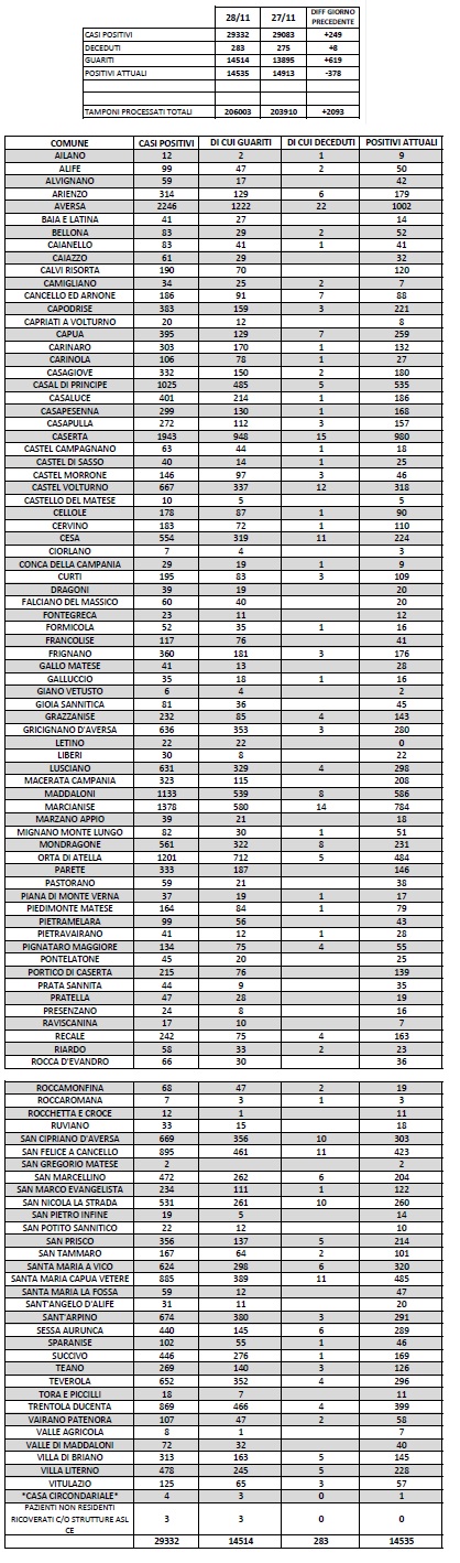 Caserta – Pubblicato il nuovo bollettino dell’Asl di Caserta sull’andamento della pandemia di Coronavirus nella nostra Provincia, oggi 29 Novembre.