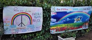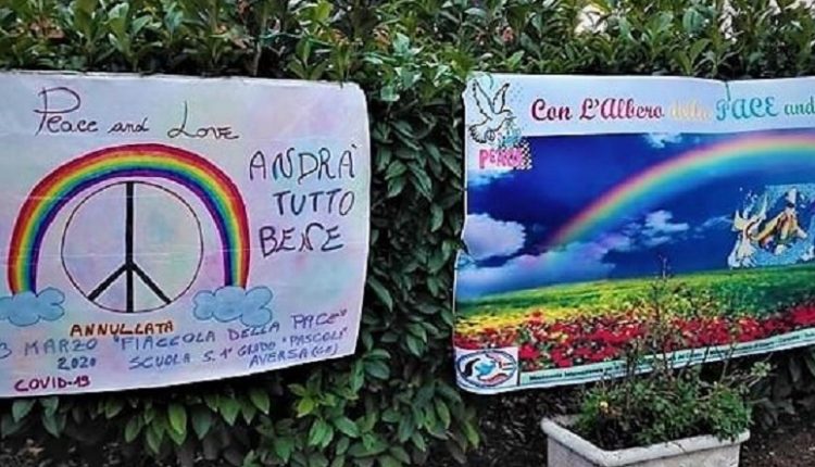 Accanto allo striscione un cartellone raffigurante l’Arcobaleno con la data della tappa della “Fiaccola della Pace” che si sarebbe dovuta tenere in questa giornata nella Città di Aversa, purtroppo annullata a causa dell’emergenza Coronavirus. In questo spazio verranno posizionati ancora altri disegni di speranza realizzati dai bambini, man mano che li faranno pervenire.