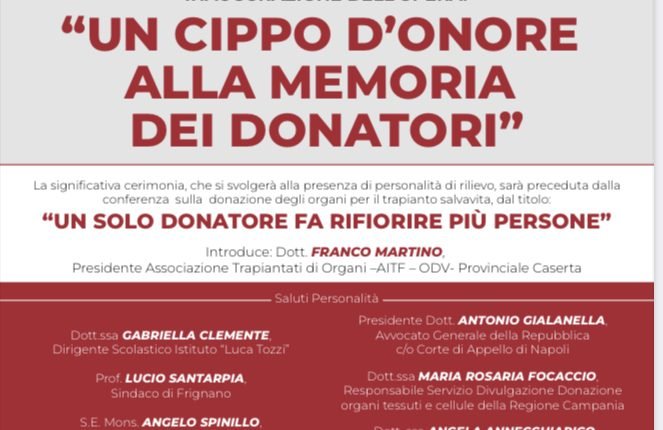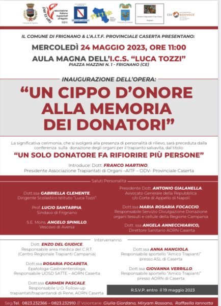 L’Associazione Italiana Donatori Organi conduce da anni un lavoro incessante per sensibilizzare alla donazione d’organi, un gesto che da una vita spezzata può farne rifiorire altre; una strada per dare senso anche alla fine improvvisa di un congiunto. La provincia di Caserta è agli ultimi posti in Italia per donazione di organi, insieme alle altre province campane. L’AIDO ha deciso di portare il tema della donazione nelle scuole, di segnare il territorio con oggetti che ricordino e richiamino all’impegno della donazione. Per questo l’associazione ha donato all’Istituto Comprensivo “Luca Tozzi” di Frignano un cippo collocato all’ingresso della scuola in piazza Mazzini, che sarà inaugurato mercoledì 24 Maggio alle ore 10,30 con un convegno intitolato “Un solo donatore fa rifiorire più persone” a cui parteciperanno il dottore Enzo Del Giudice, responsabile area medica del Centro Regionale Trapianti, le dottoresse Rosaria Focareta, Carmen Pascale, Anna Mangiola, Giovanna Verillo, impegnate nelle diverse aree che sono coinvolte nella donazione d’organi e nei trapianti.