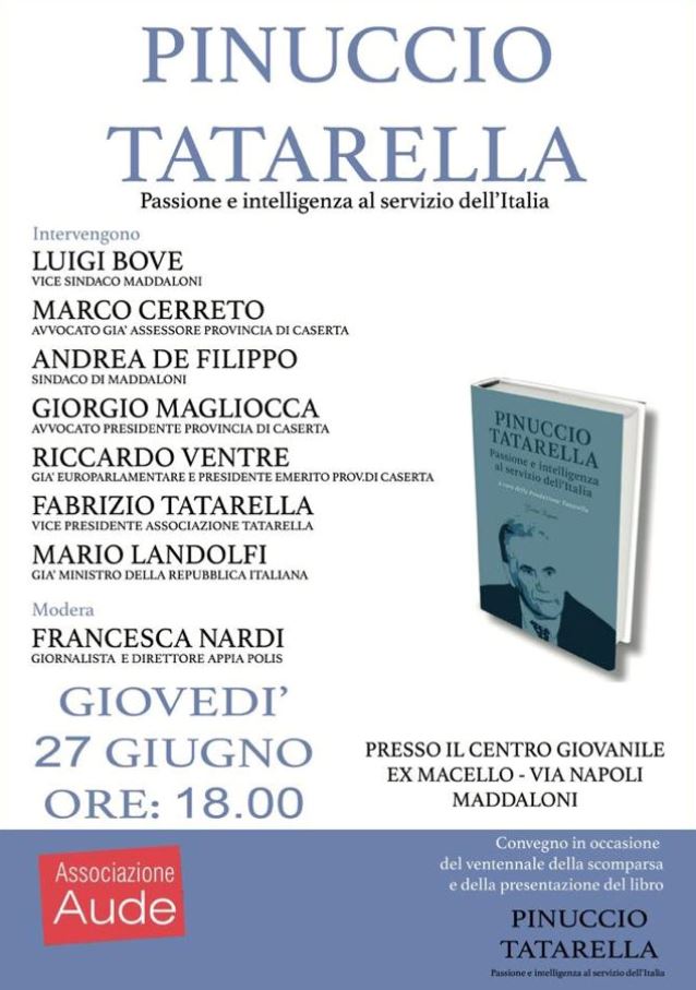 Il vice sindaco Luigi BOVE mette a confronto la tradizione politica e culturale della Destra italiana con quella moderata e cattolica nel ricordo del ventennale della scomparsa dell ex Ministro nonché vice presidente del Consiglio dei Ministri Pinuccio TATARELLA. A tal proposito, Bove per conto dell’Associazione “Aude” organizza un convegno sugli insegnamenti di Pinuccio Tatarella che si terrà giovedì, 27 Giugno 2019, dalle ore 18.00 presso il Centro Giovanile ex Macello comunale di via Napoli in Maddaloni.