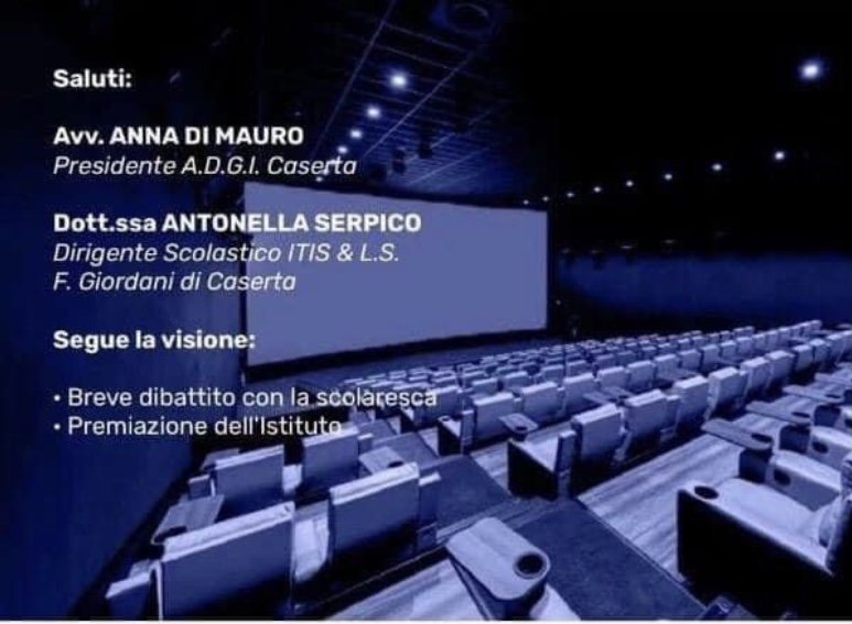 Preme ringraziare la V.D. dell’UCI Cinemas Cinepolis di Marcianise, presso il Centro Commerciale Campania, Milena Manfelotti che ha reso possibile tutto questo e lesocie Adgi Caserta Luciana Puoti per le stimolanti sollecitazioni scientifiche sulla tematica.