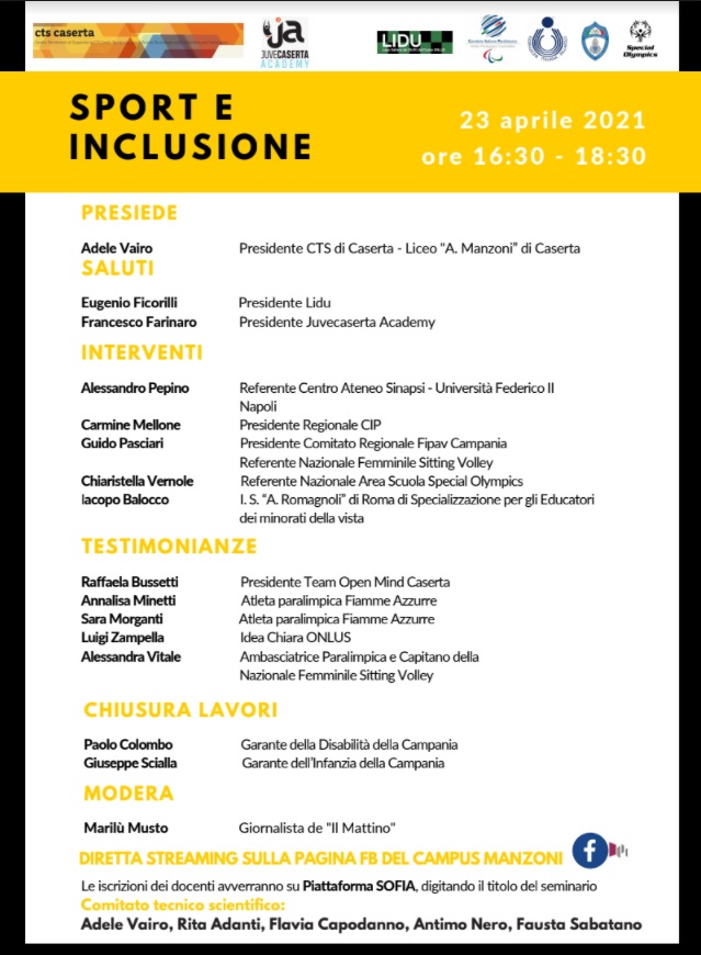 A moderare l’incontro, presieduto dalla Dirigente scolastica Adele Vairo, sarà la giornalista de «Il Mattino» Marilù Musto. Prederanno la parola per i saluti, il Presidente JuveCaserta Academy Francesco Farinaro, il Presidente Nazionale Lidu Eugenio Ficorilli. Interverranno quali relatori, il Presidente del Comitato Italiano Paralimpico Campania Carmine Mellone, il Referente del Centro Ateneo Sinapsi – Università Federico II Napoli Alessandro Pepino, il Referente della Nazionale femminile di Sitting Volley e Presidente regionale Fipav Campania Guido Pasciari, la Referente Nazionale area Scuola Special Olympics Chiaristella Vernole, il Docente dell’Istituto Augusto Romagnoli di Roma di specializzazione per gli educatori dei minorati della vista Iacopo Balocco. Inoltre, forniranno la loro testimonianza, il Presidente Team Open Mind Caserta Raffaela Bussetti e il Presidente Idea Chiara Onlus, nonché consigliere della JuveCaserta Academy Luigi Zampella. Oltre che, le atlete paralimpiche delle Fiamme Azzurre Annalisa Minetti “artista di chiara fama” e Sara