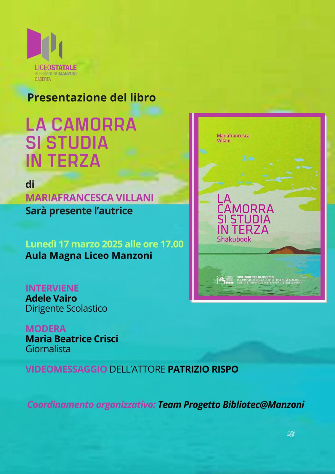 Nell’Aula Magna del Liceo Manzoni di Caserta, lunedì 17 marzo 2025, sarà presentato l’audiolibro di Mariafrancesca Villani, La camorra si studia in terza.