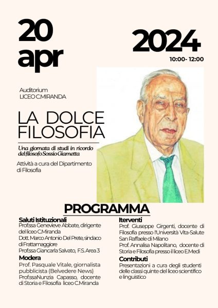 Il 20 aprile, alle ore 10:00,presso l’auditorium del liceo C.Miranda, si svolgerà una giornata di studi in ricordo del noto filosofo frattese Sossio Giametta, scomparso qualche mese fa, lasciando un una traccia unica nel panorama filosofico. La comunità scolastica, per l’occasione aprirà le sue porte al prof. Girgenti, docente di Filosofia presso l’Università Vita-Salute San Raffaele di Milano, noto studioso italiano e vicino allo studioso nietzscheano. L’evento, fortemente voluto dalla Dirigente Genevieve Abbate e a cura del Dipartimento di filosofia del liceo Miranda, sarà moderato dal giornalista della nostra testata Pasquale Vitale e dalla professoressa Nunzia Capasso. Oltre all’intervento del prof. Girgenti è previsto anche quello della professoressa Annalisa Napoletano.