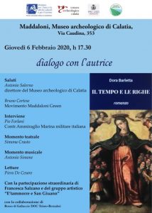 MADDALONI – Si terrà giovedì 6 febbraio 2020, con inizio alle ore 17:30, presso il Museo Archeologico di Calatia la presentazione del romanzo “Il tempo e le righe” della scrittrice maddalonese Dora BARLETTA. L’evento nasce dalla collaborazione tra il Museo Archeologico di Calatia, il Movimento “Maddaloni Green”, presieduto dal consigliere comunale Bruno CORTESE, e la Pro Loco Maddaloni.