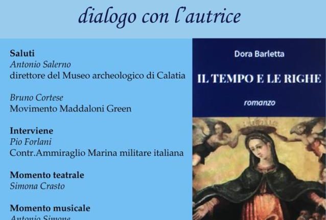 MADDALONI – Si terrà giovedì 6 febbraio 2020, con inizio alle ore 17:30, presso il Museo Archeologico di Calatia la presentazione del romanzo “Il tempo e le righe” della scrittrice maddalonese Dora BARLETTA. L’evento nasce dalla collaborazione tra il Museo Archeologico di Calatia, il Movimento “Maddaloni Green”, presieduto dal consigliere comunale Bruno CORTESE, e la Pro Loco Maddaloni.