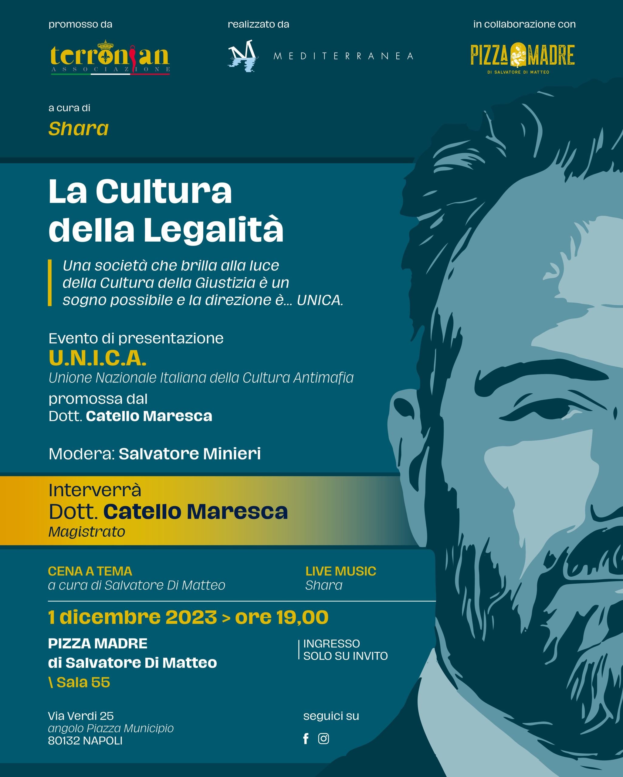 Si terrà venerdì 1° Dicembre al Pizza Madre l’evento dedicato alla Cultura della Legalità, un’iniziativa promossa dall’Associazione Terronian per la presentazione dell’Associazione U.N.I.C.A. la cui mission è fortemente sostenuta dal Dott. Catello Maresca, prezioso ambasciatore della cultura antimafia. A moderare la serata sarà il giornalista e scrittore Salvatore Minieri impegnato da sempre nella divulgazione di inchieste che hanno portato alla luce alcuni scandali nel campo delle ecomafie.