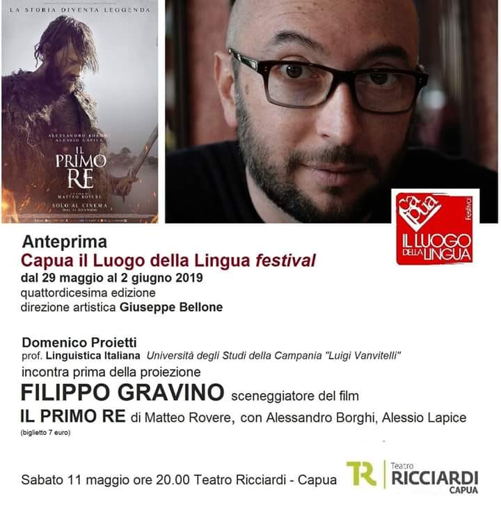 Sarà lo sceneggiatore capuano Filippo Gravino ad aprire – sabato 11 maggio alle ore 20.00 al cine-teatro Ricciardi – la XIV edizione di ‘Capua il Luogo della Lingua Festival’. Una vera e propria anteprima della rassegna, promossa dall’associazione Architempo e di cui è direttore artistico Giuseppe Bellone, che si svolgerà dal 29 maggio al 2 giugno prossimi. Sceneggiatore di film di successo come ‘Veloce come il vento’, ‘Alaska’, ‘Perez’ e ‘Alì ha gli occhi azzurri’, Gravino presenterà a Capua il suo ultimo lavoro: ‘Il Primo Re’, diretto dal regista Matteo Rovere con Alessandro Borghi e Alessio Lapice.