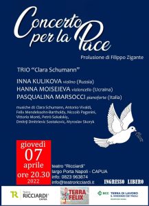 A seguire, giovedì 7 aprile ore 20.30, il concerto per la pace con il trio “Clara Schumann” e la prolusione di Filippo Zigante una prolusione di Filippo Zigante con Inna Kulikova (violino); Hanna Moiseieva (violoncello), Pasqualina Marsocci (piano); e con le musiche di Clara Schumann, Antonio Vivaldi, Felix Mendelssonhn-Bartholdy, Niccolò Paganini, Vittorio Monti, Petrò Sokalskiy, D.D. SOstakovic, Myroslav Skoryk. Per ulteriori prenotazioni scrivere a info@teatroricciardi.it