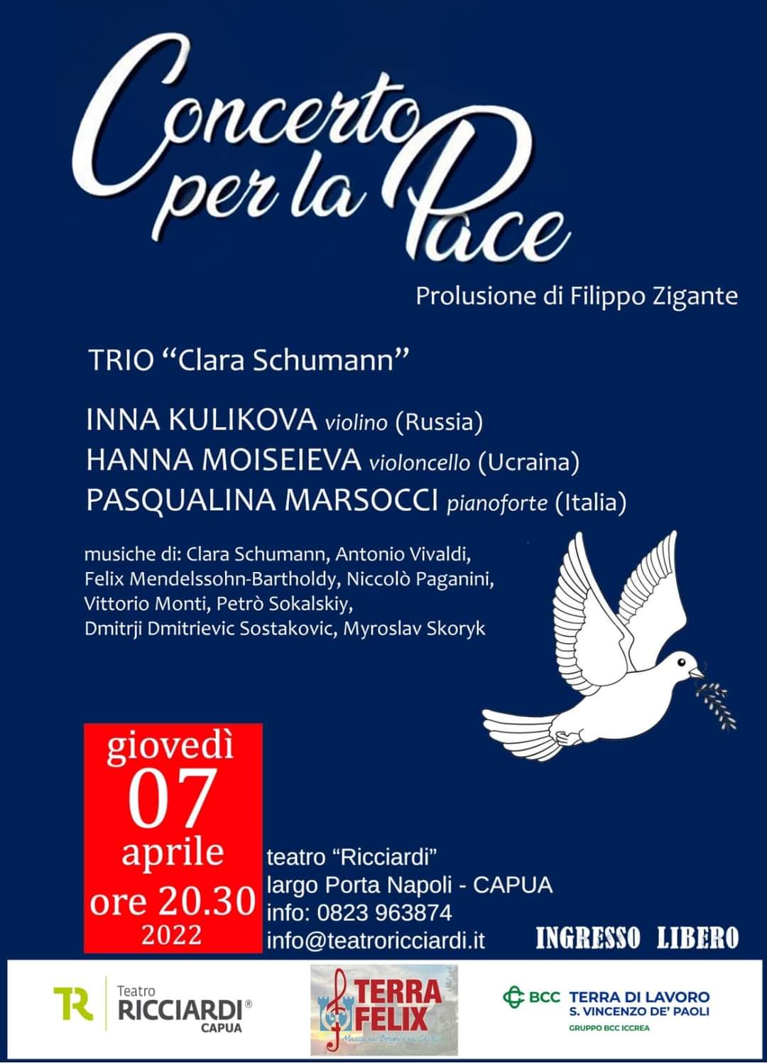 A seguire, giovedì 7 aprile ore 20.30, il concerto per la pace con il trio “Clara Schumann” e la prolusione di Filippo Zigante una prolusione di Filippo Zigante con Inna Kulikova (violino); Hanna Moiseieva (violoncello), Pasqualina Marsocci (piano); e con le musiche di Clara Schumann, Antonio Vivaldi, Felix Mendelssonhn-Bartholdy, Niccolò Paganini, Vittorio Monti, Petrò Sokalskiy, D.D. SOstakovic, Myroslav Skoryk. Per ulteriori prenotazioni scrivere a info@teatroricciardi.it
