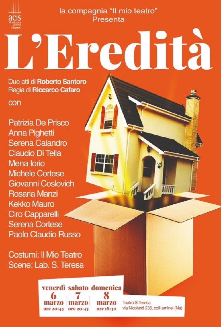 Debutta venerdì 6 marzo 2020 alle ore 20:45, con replica sabato 7 marzo alle ore 20:45 e, infine, domenica 8 marzo alle ore 18.30, al teatro S. Teresa sito in Via Nicolardi a Napoli (Colli Aminei), il regista partenopeo Riccardo CAFARO, e lo fa con la sua Compagnia teatrale “Il mio Teatro” in una divertente e non banale commedia, dal titolo “L’Eredità”