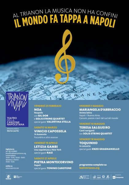 Dopo l’inaugurazione del 23 febbraio, con il ritorno al Trianon Viviani di Noa, affiancata da Gil Dor e il Solis string quartet, in “NOApolis”, con l’ospite speciale Valentina Stella, la rassegna proseguirà il 16 marzo con Vinicio Capossela in ‘A Aussenzia. Pucundria e altre assenze. ln questo concerto, dedicato proprio al teatro della Canzone napoletana, il cantautore, polistrumentista e scrittore, tra gli artisti che hanno ricevuto il maggior numero di riconoscimenti da parte del club Tenco, proporrà la sua riflessione musicale su «saudade, duende, dalkas e altri demoni nelle musiche dell’assenza».