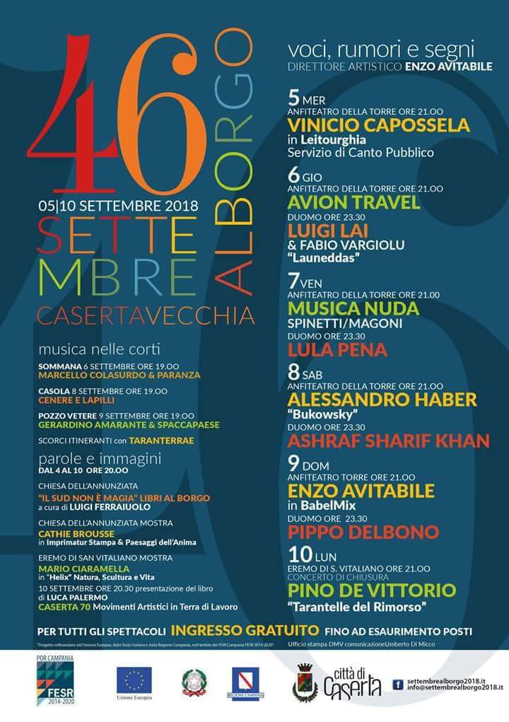 Venerdi’ 31 Agosto alle ore 12, presso la Sala Giunta del Comune di Caserta, ci sarà la conferenza stampa della 46esima edizione di “Settembre al Borgo”, storica rassegna che anche quest’anno è organizzata dal Comune di Caserta e finanziata dalla Regione Campania. La manifestazione si svolgerà dal 5 al 10 settembre a Caserta Vecchia e quest’anno avrà Enzo Avitabile come direttore artistico.