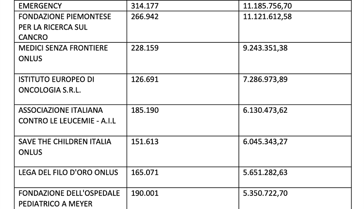 La top ten vede le seguenti organizzazioni, con l’ingresso del Meyer, la crescita di AIRC, IEO, AIL, Save the children, Lega del Filo d’Oro. L’elenco degli ammessi comprende in totale 56.908 enti, suddivisi per categoria: in cima alla classifica gli enti del volontariato (46.312), a seguire le associazioni sportive dilettantistiche (9.892), gli enti impegnati nella ricerca scientifica (480), quelli che operano nel settore della sanità (106), gli enti dei beni culturali e paesaggistici (94) e gli enti gestori delle aree protette (24). Sono presenti anche i Comuni (in tutto 8.029) Gli enti a zero firme occupano le ultime 30 pagine del pdf; fra essi, moltissimi comuni. I Comuni sono stati scelti da 532.770 cittadini, per 14.926.276,46 euro. Il più amato è il Comune di Roma, che raccoglie 9.274 firme (per 385.954,49 euro), seguito da Milano ( 6.689 firme e 373.798,49 euro raccolti).