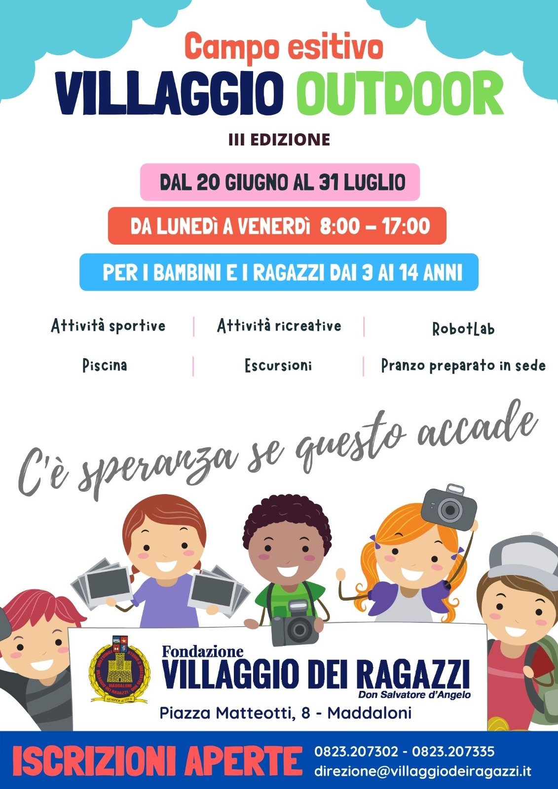 Dopo le positive esperienze degli ultimi anni, arriva, a grande richiesta, la III edizione di “VillaggioOUTdoor “C’è speranza se questo accade”, il campo estivo per bambini/e e ragazzi/e di età compresa tra i 3 e i 14 anni organizzato dalla Fondazione Villaggio dei Ragazzi “don Salvatore d’Angelo”. L’edizione 2022 del Campo, che nel pieno rispetto della normativa anti Covid 19 si svolgerà all’interno della struttura della Fondazione dal 20 giugno al 31 luglio (dal Lunedì al Venerdì, dalle 8.00 alle 17.00), offrirà ai ragazzi nel periodo dell’anno dedicato al riposo per la sospensione di tutti gli impegni scolastici un tempo certamente di svago ma di natura “costruttiva”. Il tempo d’estate che i ragazzi trascorreranno al “Villaggio”, quindi, permetterà ai giovani ospiti di recuperare le energie perdute ma anche di “crescere” ulteriormente. “Il nostro Campus – ha dichiarato Felicio De Luca, Commissario Straordinario dell’Ente di Piazza Matteotti – sarà strutturato senza dubbio sulle attività ludico-ricreative e fungerà da supporto alle tante famiglie che vivono la difficoltà di conciliare la vita lavorativa con le esigenze di cura dei figli ma certamente adempierà anche ad una funzione educativa”. Il Campus “Villaggio”, al fine di un’ armoniosa organizzazione delle attività previste , potrà accettare non oltre un determinato numero di iscrizioni. Gli interessati potranno ricevere tutte le informazioni telefonando ai numeri 0823/207335 – 0823/207301 oppure recandosi in Fondazione dal lunedì al venerdì, dalle ore 10.00 alle ore 14.00, entro il 18 giugno p.v.